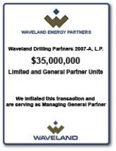 Waveland Drilling Partners 2007-A, L.P. was formed by Waveland Energy Partners LLC to enable investors to own diversified working interests in oil and natural gas properties located in Central and Southeastern Oklahoma, the Texas-Louisiana Gulf Coast, and East Texas. The Oklahoma properties are ‘Resource Plays’ where hydrocarbons are known to be present, whereas the Texas-Louisiana Gulf Coast and East Texas properties are predominantly higher impact exploration prospects with higher risk and higher return profiles. To maintain diversification and mitigate risk, roughly two-thirds of the Fund’s portfolio will be allocated to Resource Play Projects. The remaining one-third of the Fund’s portfolio will be allocated to exploration prospects.