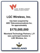 LGC Wireless is a leading supplier of global wireless networking solutions. The company's products enable high-speed wireless voice and data communications in dense urban areas as well as inside public and private structures. LGC ships its products to customers in over 30 countries and supports all major wireless access standards, including TDMA, CDMA, GSM, iDEN, 1xRTT, Ev-DO, GPRS, W-CDMA, UMTS and 802.11.