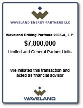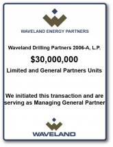 Waveland Drilling Partners 2006-A, L.P. was formed by Waveland Energy Partners LLC to enable investors to own diversified working interests in oil and natural gas properties located in Central and Southeastern Oklahoma, the Texas-Louisiana Gulf Coast, and East Texas. The Oklahoma properties are ‘Resource Plays’ where hydrocarbons are known to be present, whereas the Texas-Louisiana Gulf Coast and East Texas properties are predominantly higher impact exploration prospects with higher risk and higher return profiles.