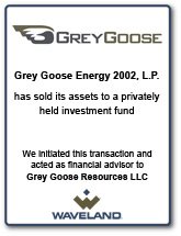 Grey Goose Energy Partners 2002, L.P. was funded in December 2002. 100% of the partnership's assets were sold in September 2004 for a 116.8% pre-tax return of investor capital, including prior distributions from operations. Investors in the partnership also received an up-front tax deduction equal to 95% of their investment.