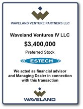 Following the prior rounds of common stock financing, Waveland was able to structure a Series A Preferred Stock financing at the same valuation as the prior common stock financing almost two years prior, thus gaining an extremely favorable risk adjusted return position vis-Ã -vis the common shareholders. At the conclusion of the initial $4 million in Series A financing, Boston Scientific Corporation (NYSE:BSX) invested an additional $1 million, acquiring Series A shares at a valuation of 2x that of Waveland's investors. Estech also entered into a strategic distribution agreement with Boston Scientific.